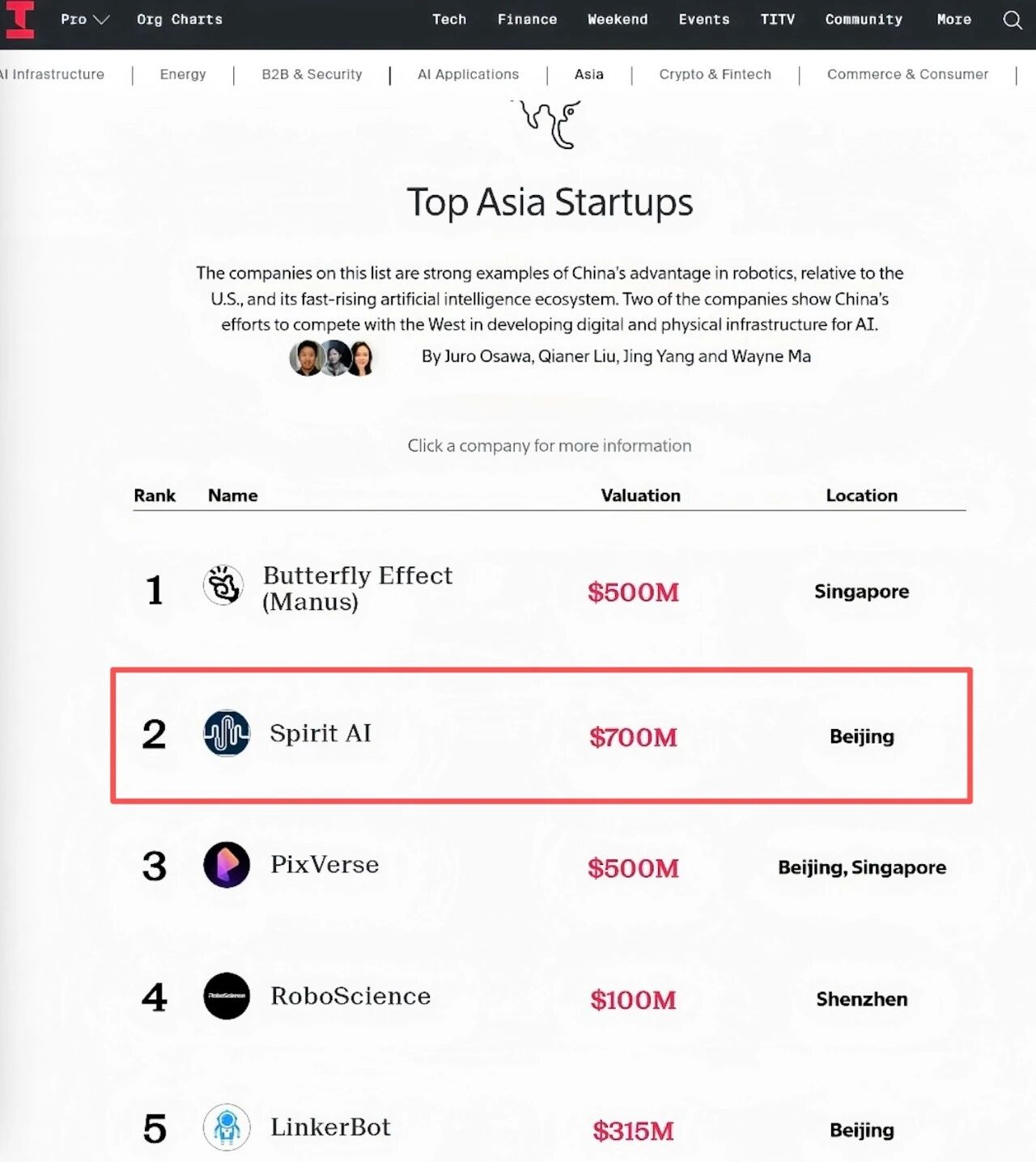 全球知名科技媒体《The Information》近日发布年度权威榜单——“2025年全球最具潜力50家创业公司”(The Information’s 50 Most Promising Startups of 2025)。千寻智能(Spirit AI)凭借其在具身智能领域的创新技术与高成长潜力,荣登该榜单亚洲区第二名,成为全球资本瞩目的硬科技新星。